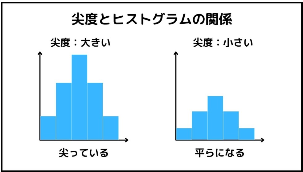 尖度が0より大きい場合は尖った分布、0より小さい場合は平らな分布を示します。